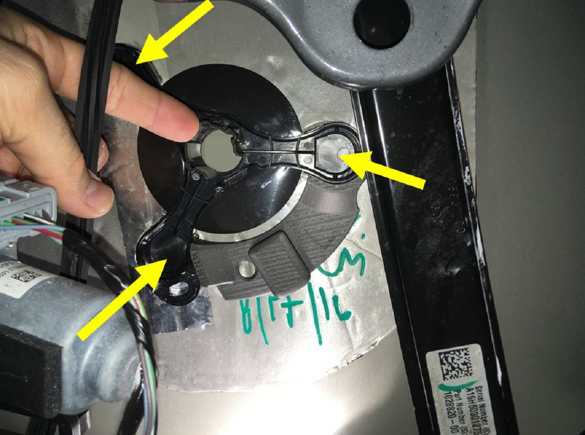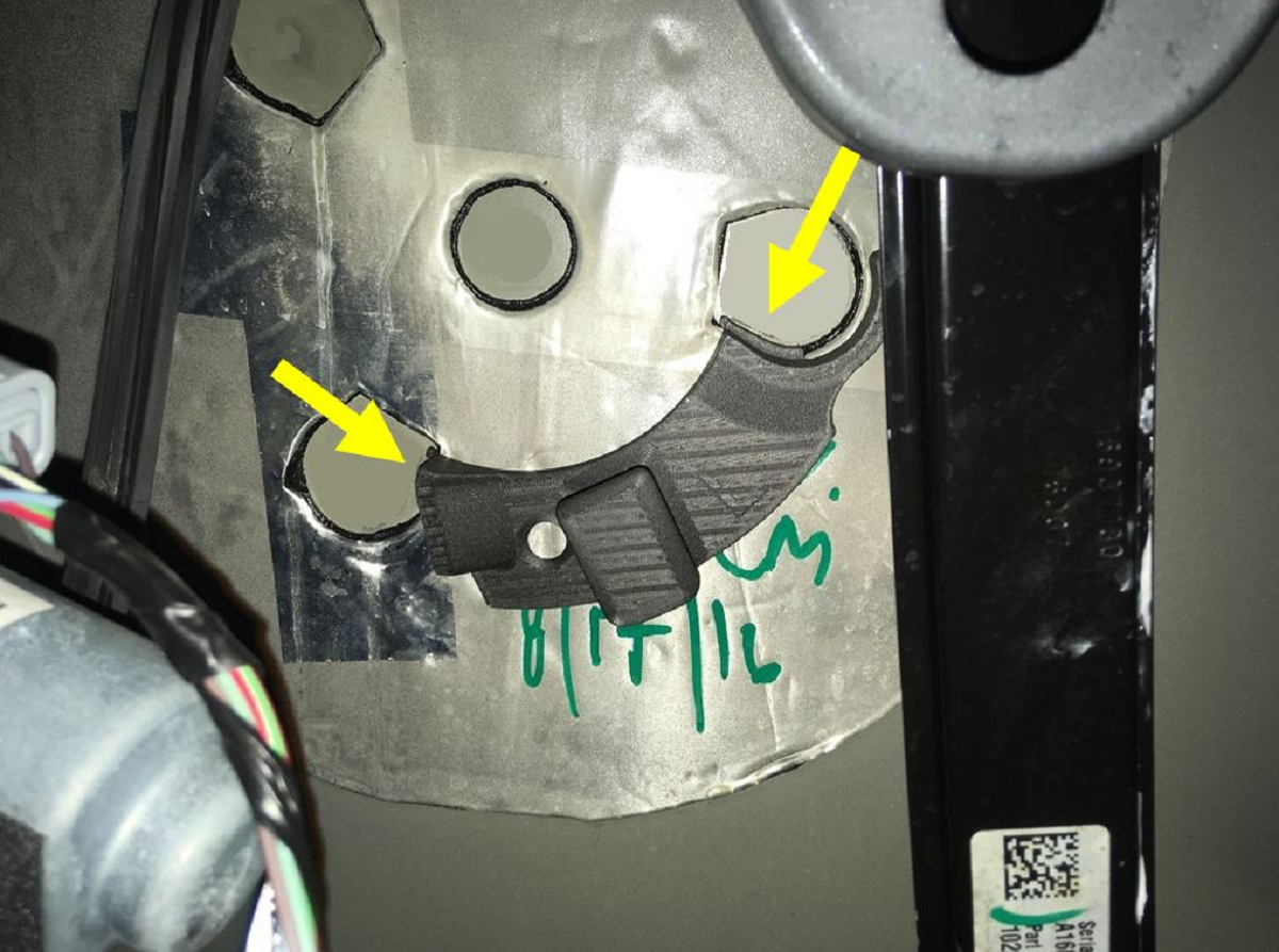 - Use a plastic scraper to clean the excess adhesive tape from the 3 mounting areas on the door panel.