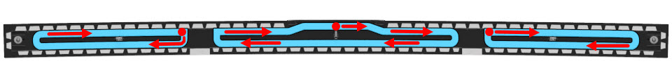 Apply sealant on the new rear roof applique. Use the path directed in the following image, starting at the dots and following the arrows.