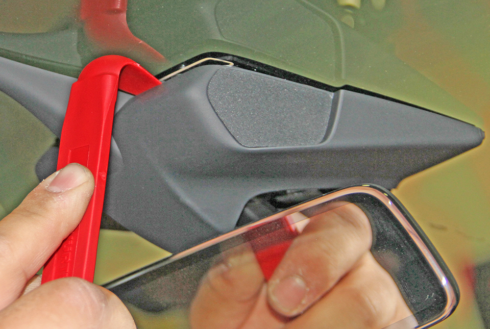 CAUTIONTake care not to damage component(s). Before disassembling, verify the bracket is firmly adhered on the windshield. If the urethane bead is separated from the glass, the bracket is not properly adhered. Report any abnormality. Urethane can be added under the bracket to re-adhere it to the glass. See https://toolbox.tesla.cn/articles/47250.NoteThe following image shows the rear view mirror still installed.