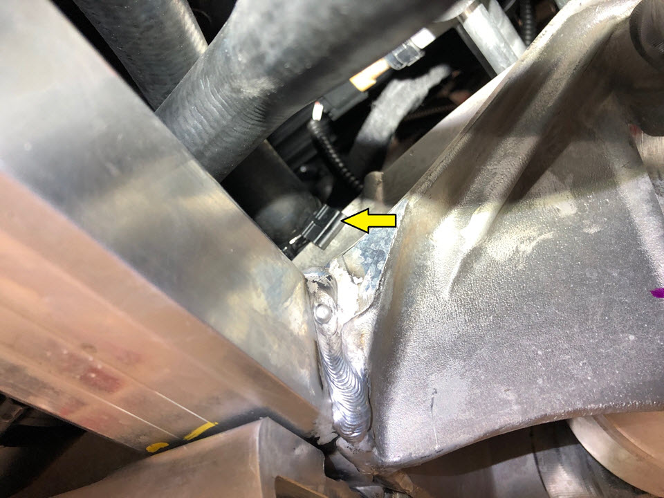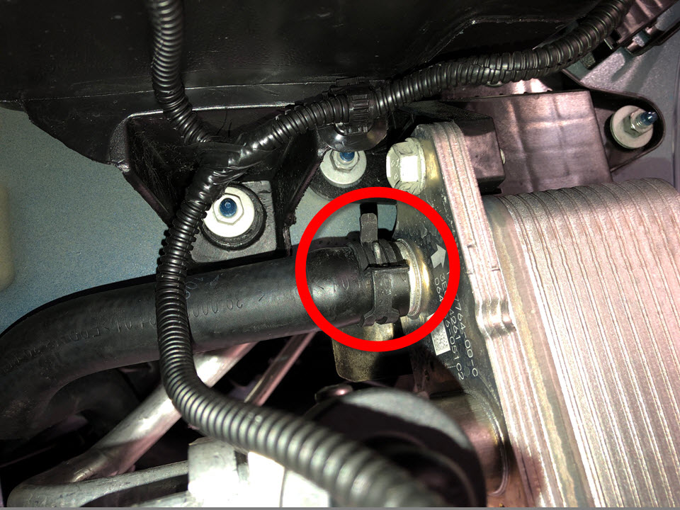Remove the fir tree clip that attaches the 4-way valve-to-chiller hose to the front subframe assembly.