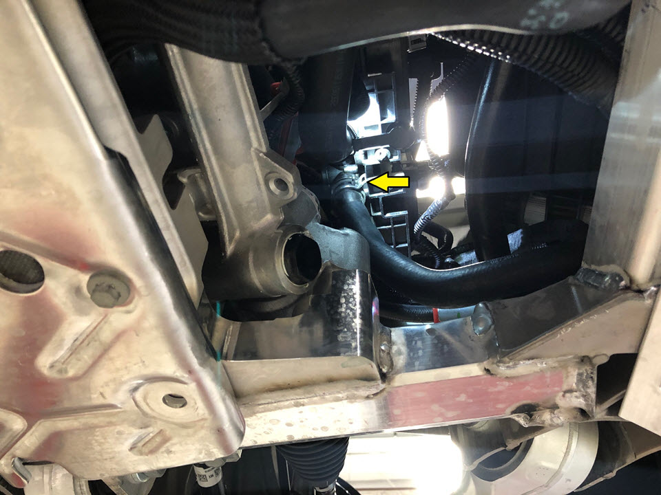 Remove the edge clip that attaches the 4-way valve-to-chiller hose to the front subframe assembly.
