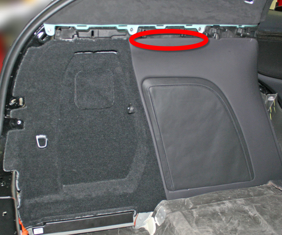 - While pulling up on the hook in the rear of the carpet, remove the trunk side trim panel from the vehicle.