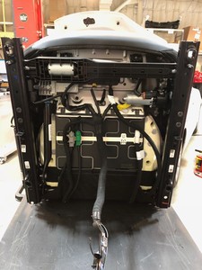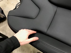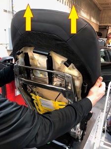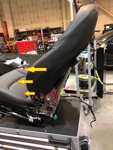 NoteStart by sliding the foam trim straight onto the seat back frame, Ensure the posts for the headrests engage the seat back foam, Ensure the heater harness and lower trim that engages the frame are pushed through to the back side of the frame, Ensure that both sides of the seat back cushion overlap the seat back frame