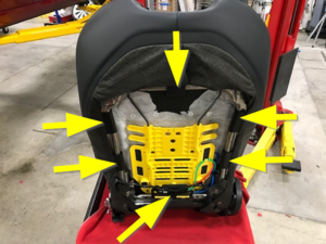 Note6x clips, Start at the top of the seat and pull the shell away from the frame, When the side clips are free, pull the bottom and carefully roll the bottom tabs out of the slots, If pulled straight out, the clips on the seat back can break off