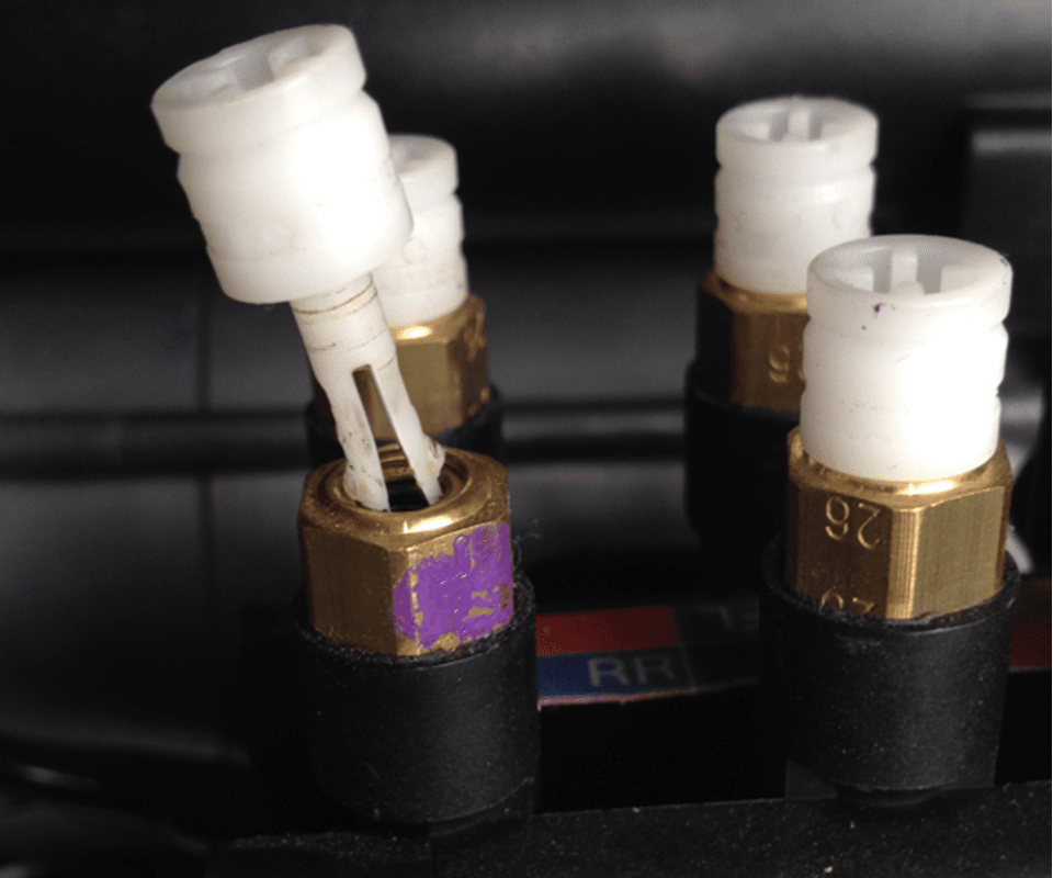 - Insert the appropriate air suspension line fully into each fitting, and then lightly pull on each line to make sure that it is secure.