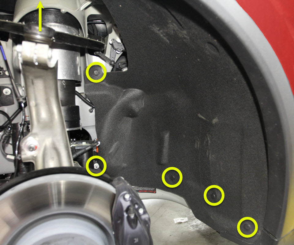 Unfold the wheel arch liner back to its mounting position, and then install the push clips (x5) and nut that attach the liner to the body (torque 6 Nm).