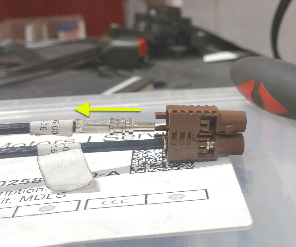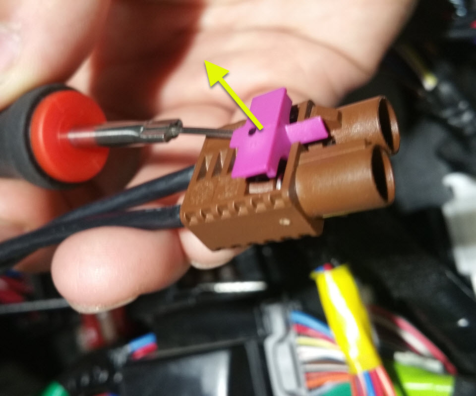 Use the pin drag kit to carefully lift and remove the purple locking insert out of the dual connector.