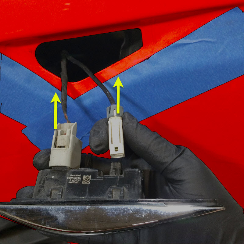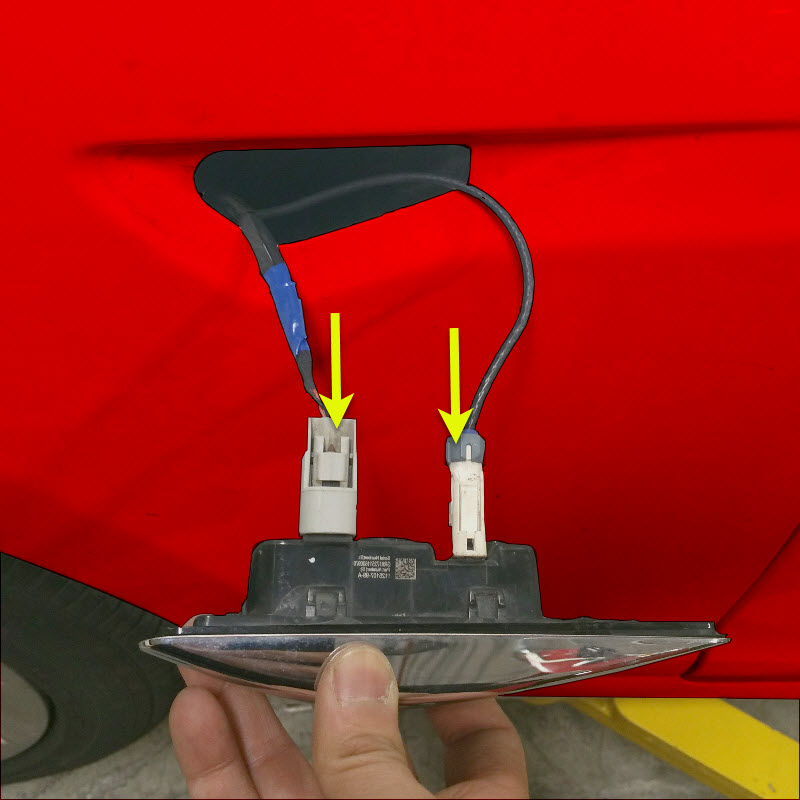 Disconnect the repeater electrical harness from the LH side repeater connectors, and then remove the repeater assembly from the vehicle.