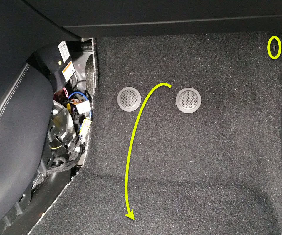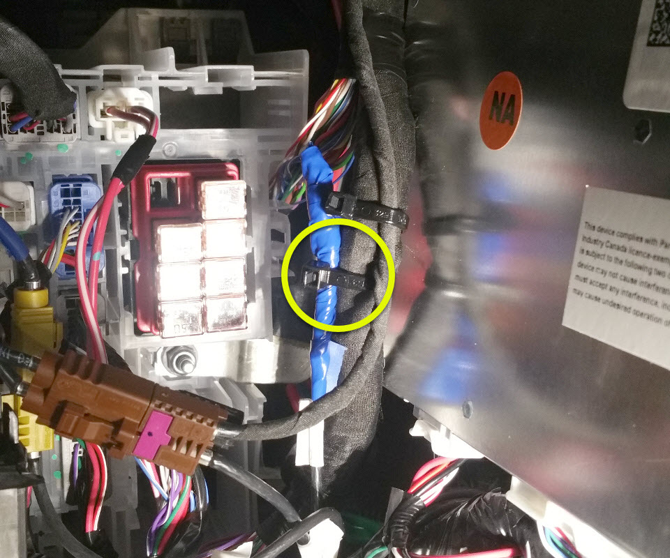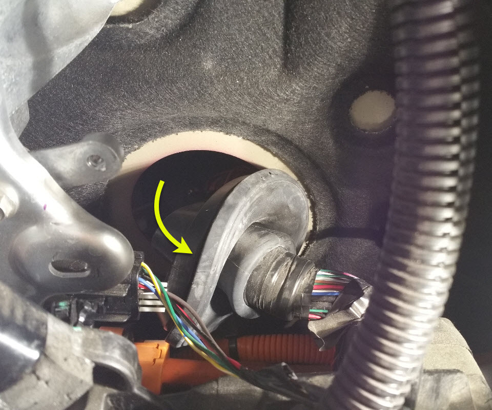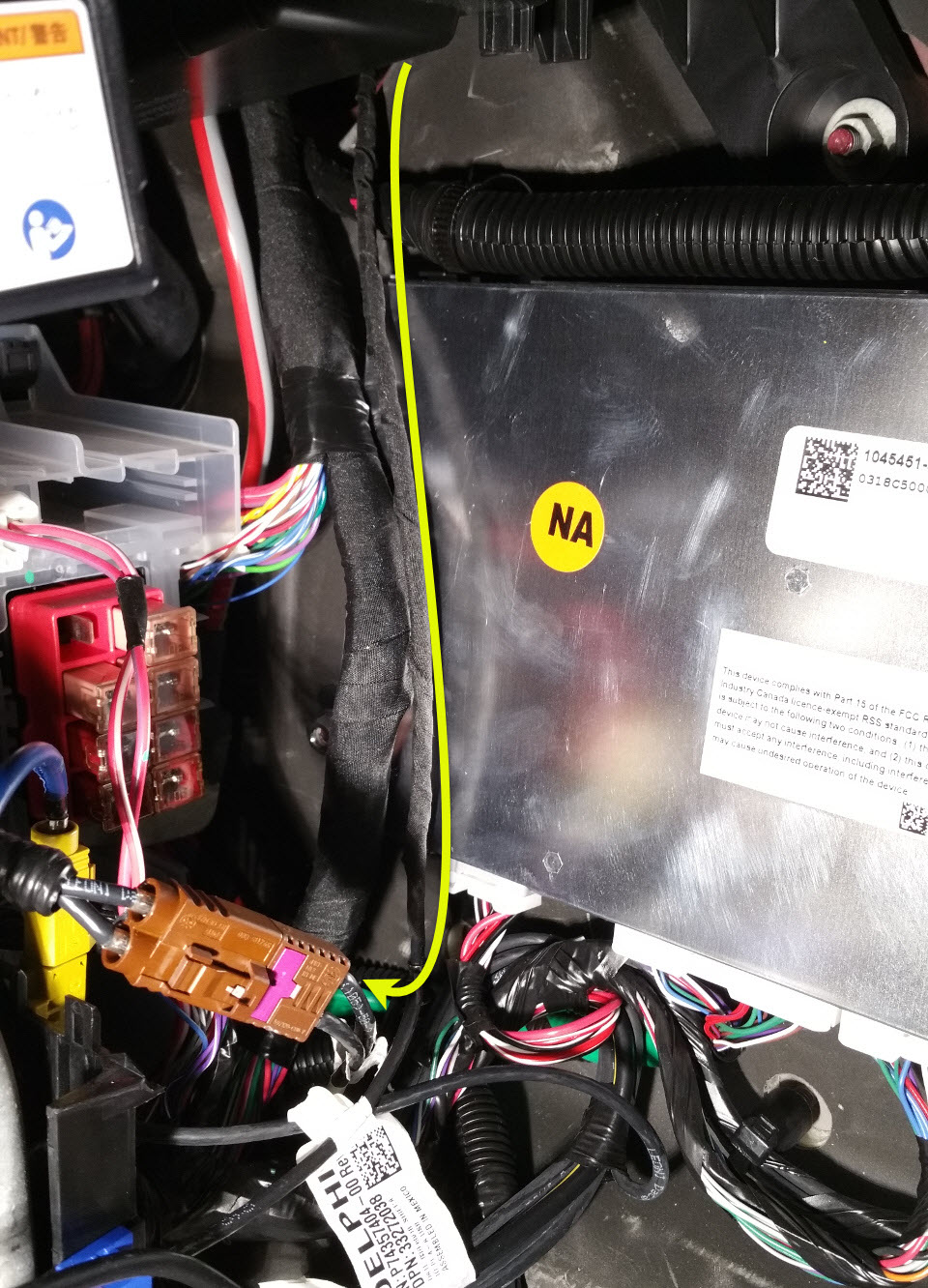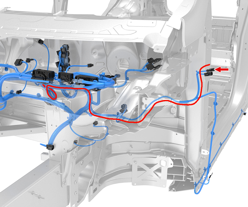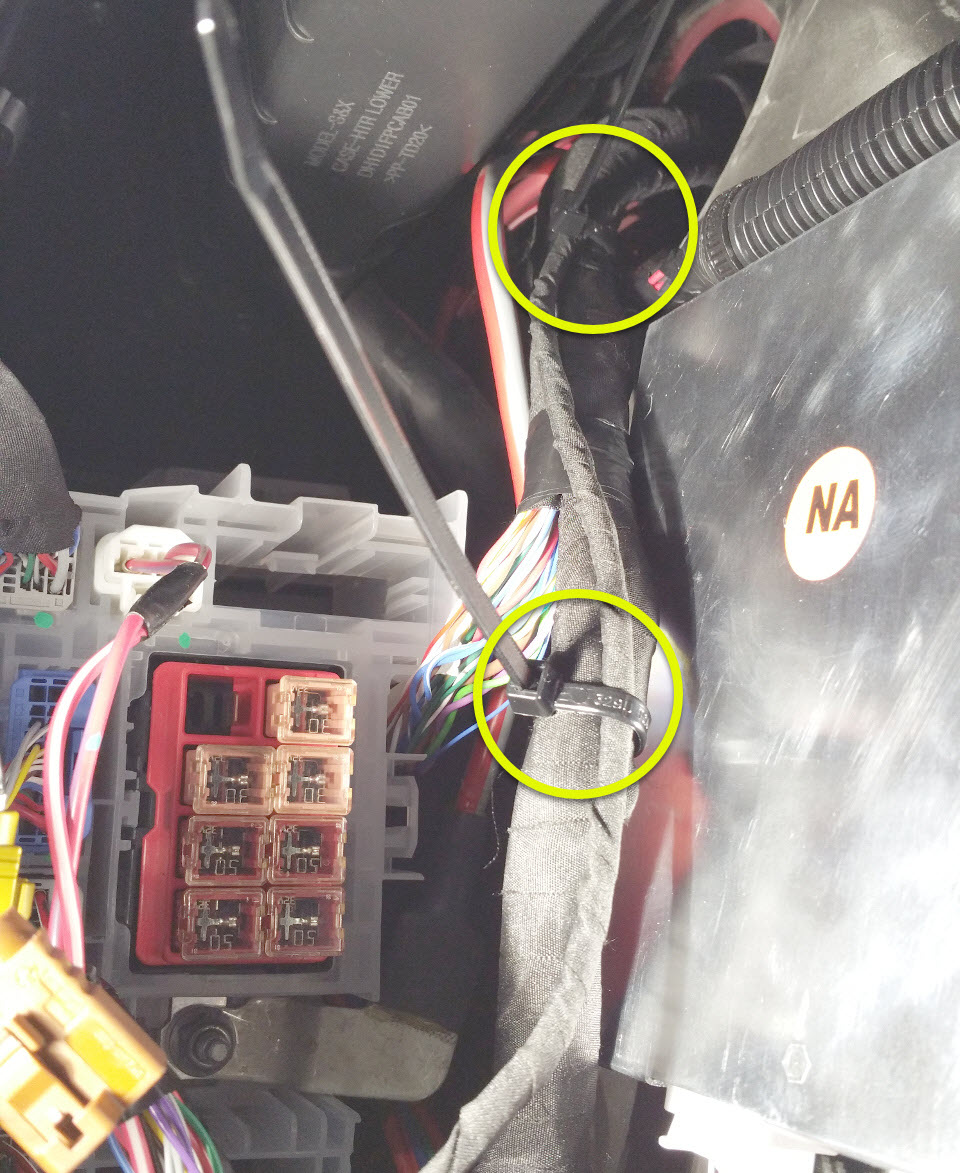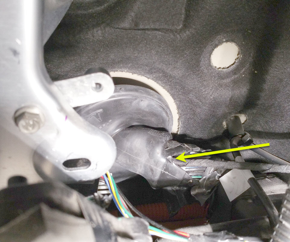Route the LH repeater coax cable along the frunk electrical harness, along the old coax cable, and out the side repeater hole in the LH fender.