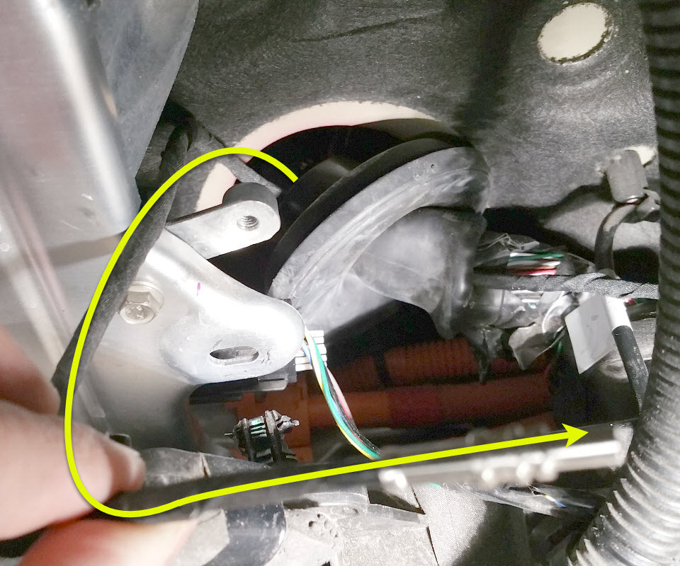 Remove the screw that attaches the ground strap to the HV junction box, and then release the clips (x3) that attach the main front electrical harness to the bulkhead.