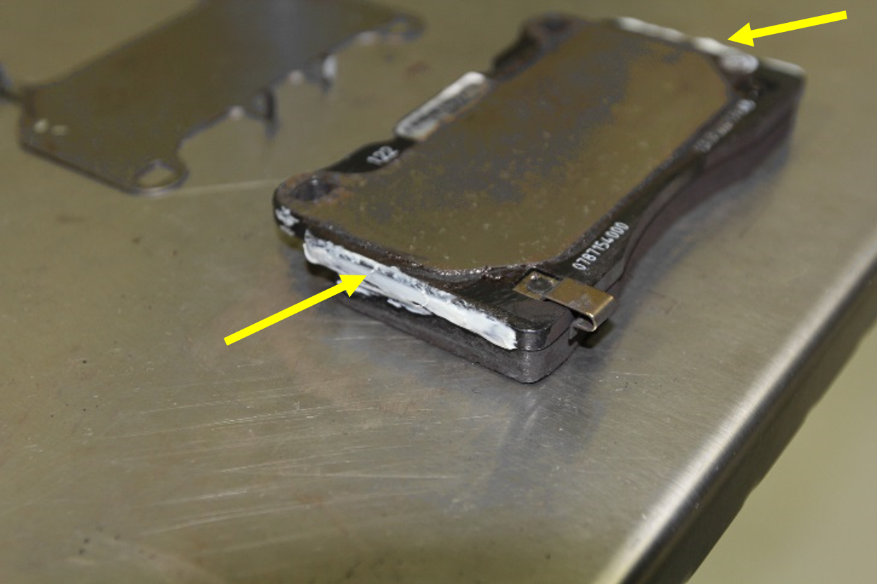 anti-rattle springs, the brake pad shims, and the brake pad edges and