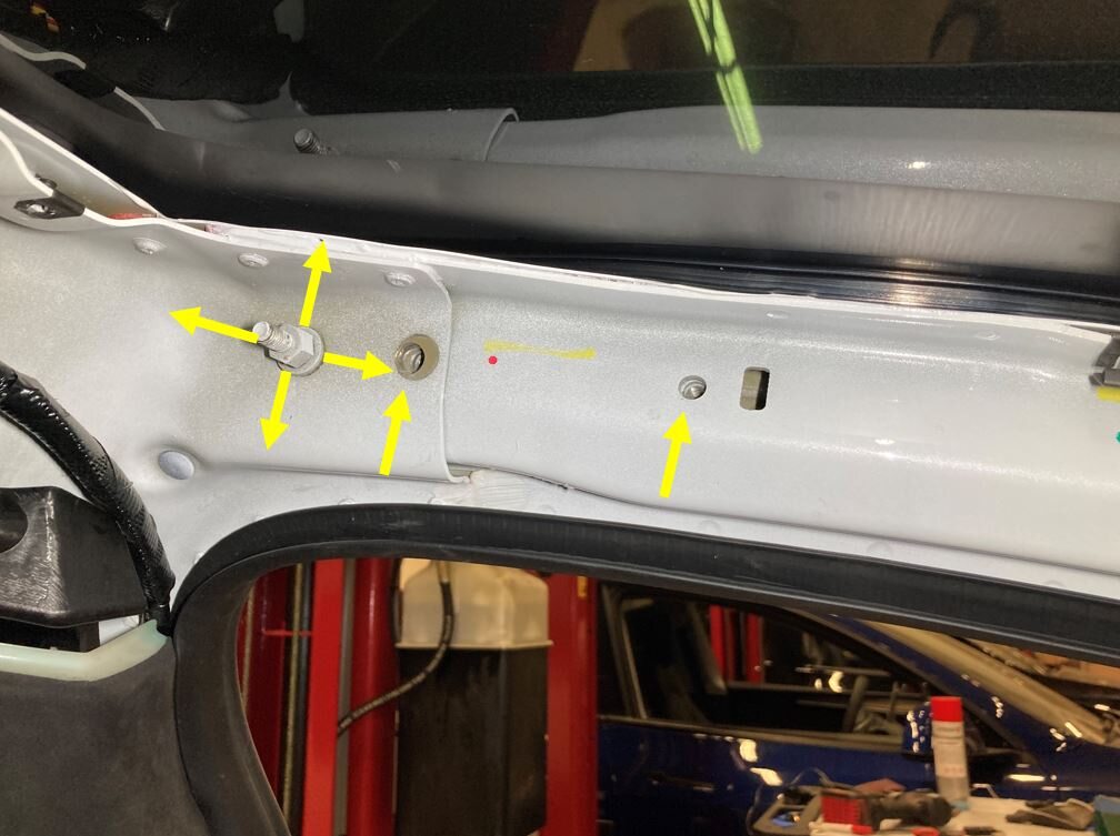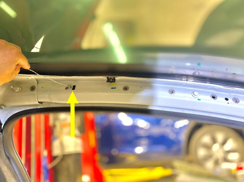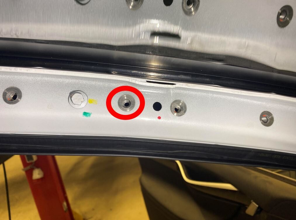 NoteManeuver the wire with the nut into the A-pillar reinforcement until it is aligned with affected riv nut hole, use straight pick if needed to align, pay attention to contact the the mating face of the nut with A-pillar reinforcement
