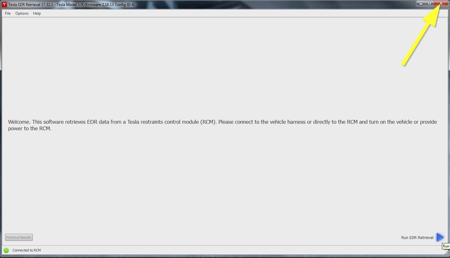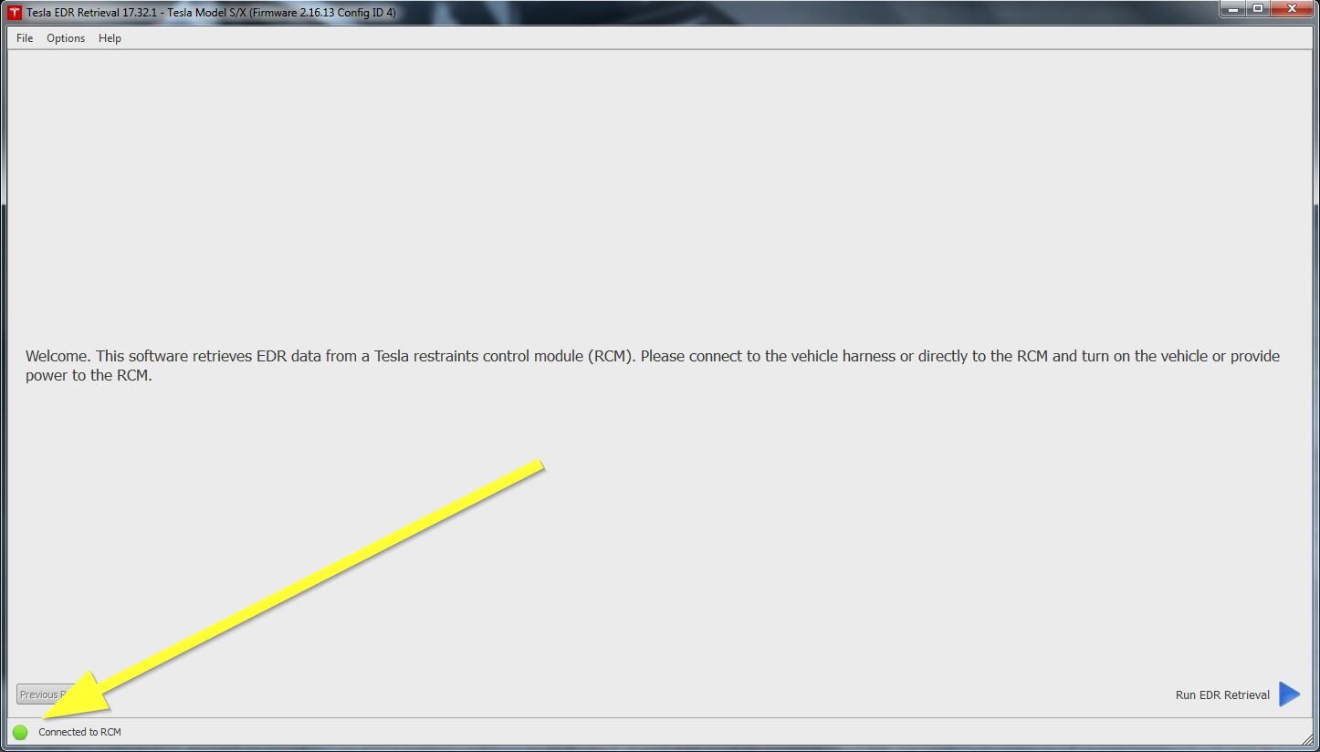 Open the Tesla EDR Retrieval Program. The program automatically attempts to connect to the RCM.