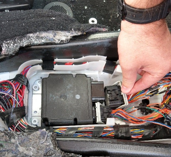 If the In-Vehicle Connection procedure is unsuccessful, you might be able to connect to the Restraint Control Module (RCM) directly, and establish a direct-to-module connection. The RCM is located forward of the center console, below the instrument panel and center screen.