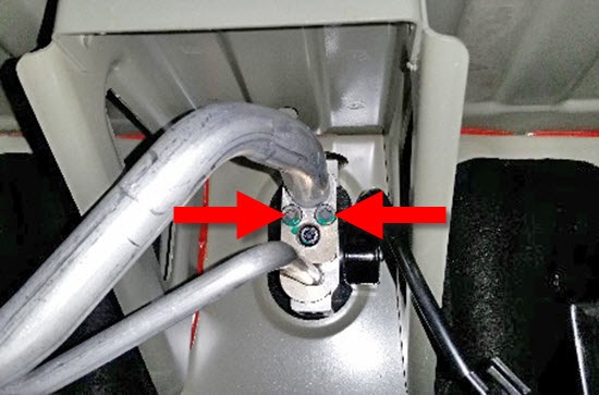 Remove the nut that secures the charge port low pressure pipe to the condenser-to-chiller low pressure pipe (torque 20 Nm).