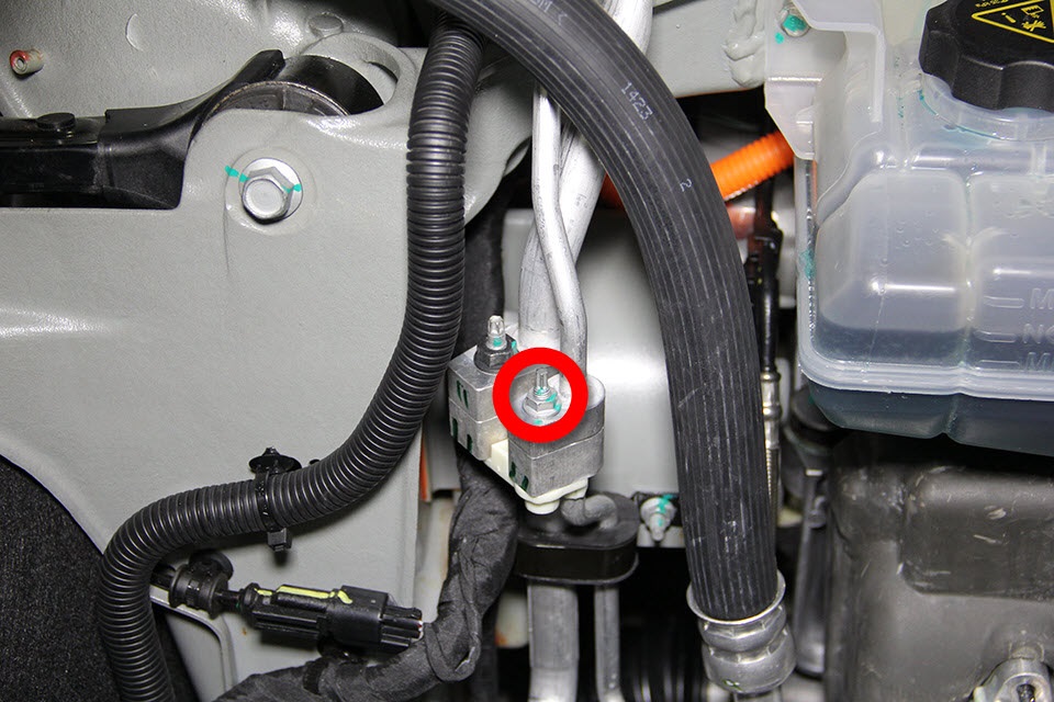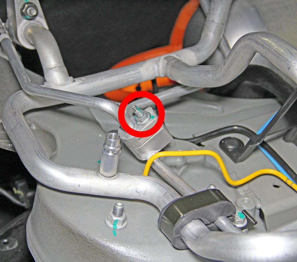 Remove the nut that secures the charge port high pressure pipe to the condenser-to-chiller high pressure pipe (torque 10 Nm).