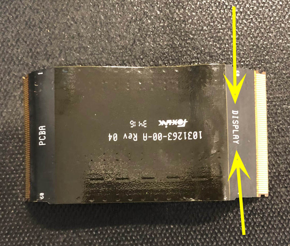 NoteThe ribbon cable is marked with "DISPLAY" and "PCBA" to assist with orientation. Make sure the natural bend in the ribbon cable makes the PCBA side curl towards the inner side of the assembly.