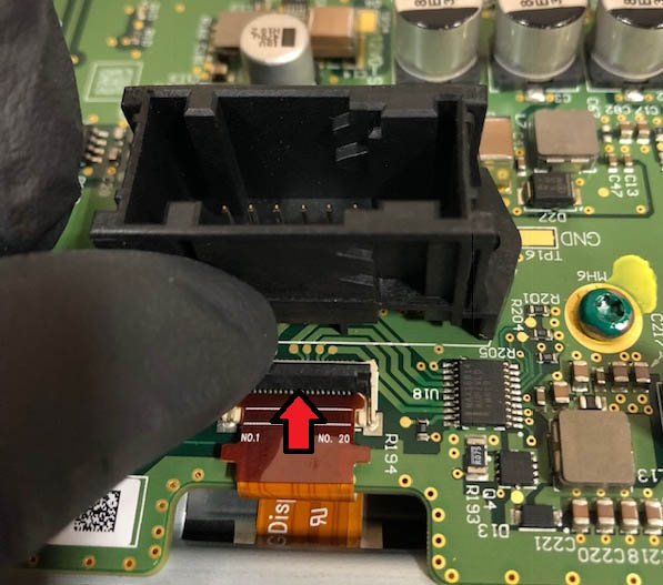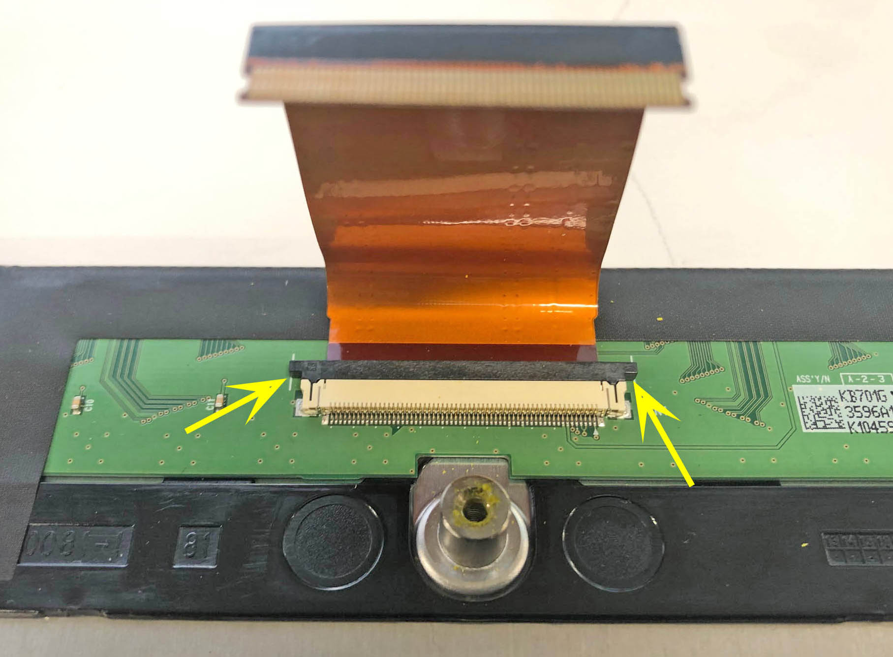 Transfer the larger ribbon cable to the new display by inserting the correct end of the ribbon cable into the connector and then closing the locking tabs. Make sure the ribbon cable is secured.