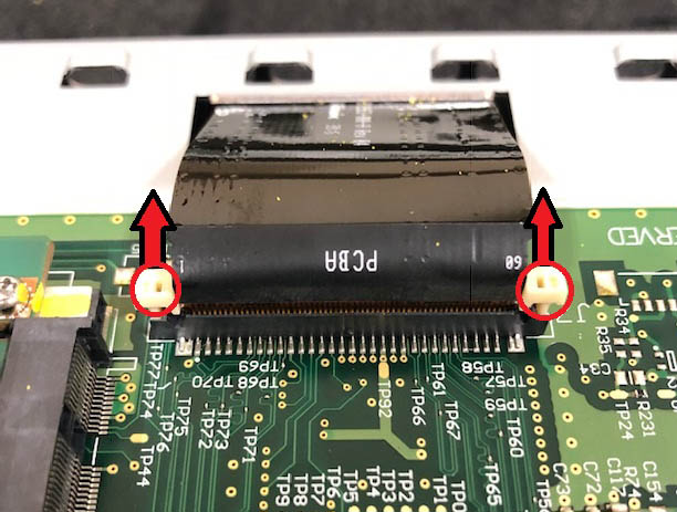 Carefully release the locking tabs on each side of the larger ribbon cable by pulling them up, and then carefully release the larger ribbon cable from the circuit board.