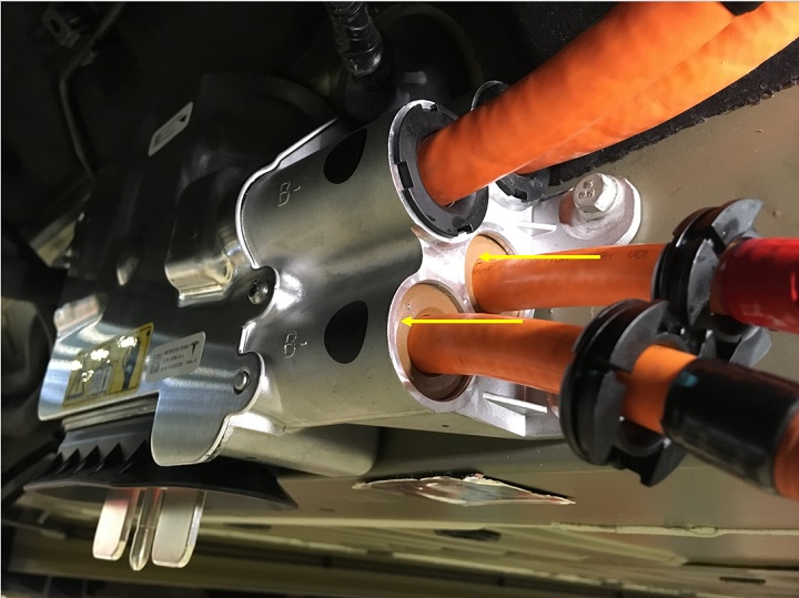 - Installez les anneaux de retenue sur l'extrémité des câbles HV B+ et B-.