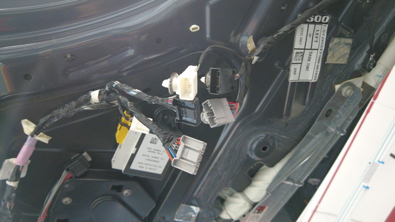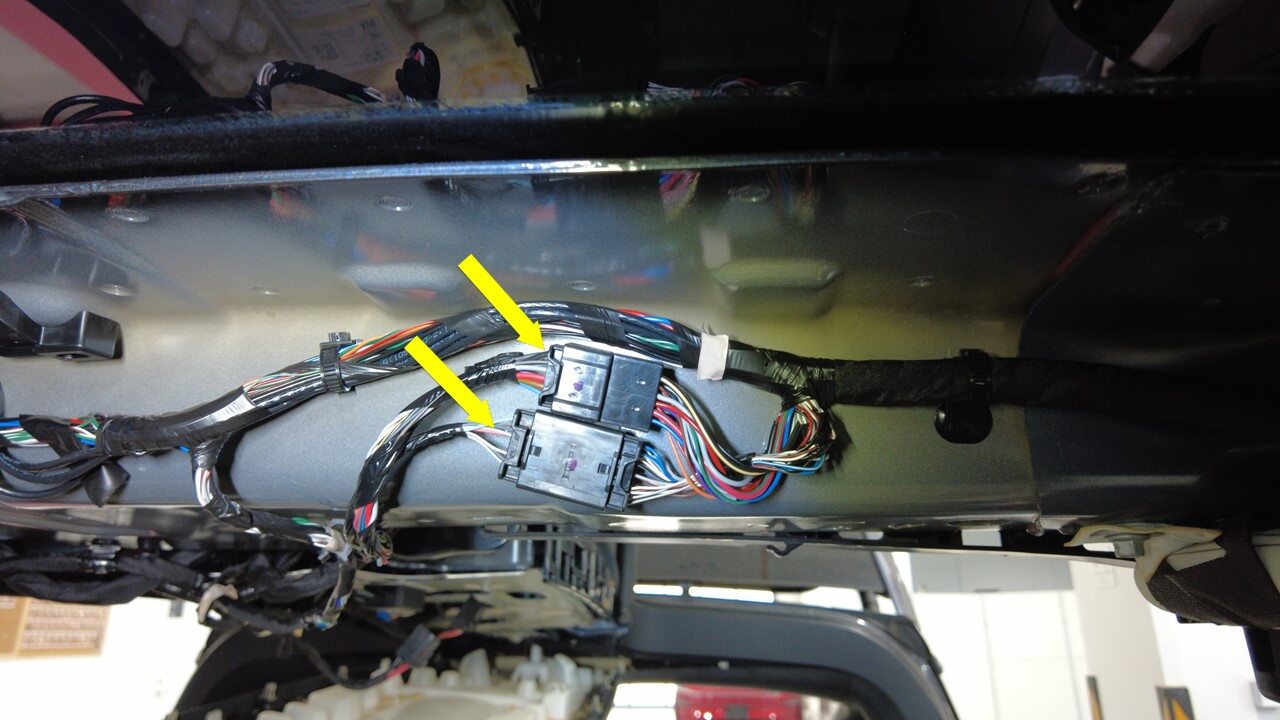 Connect LH rear door harness connectors to falcon door controller