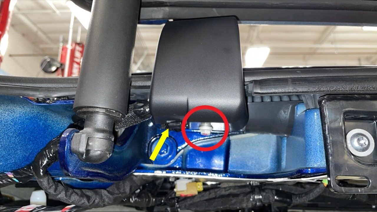 Remove bolt securing ground to LH lower falcon door