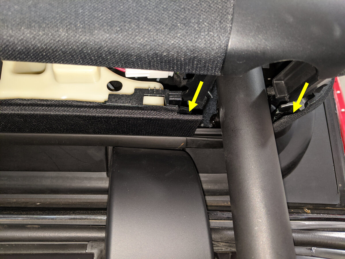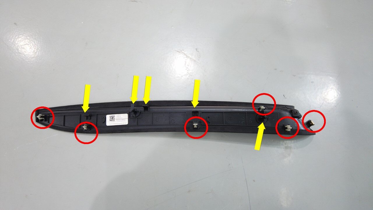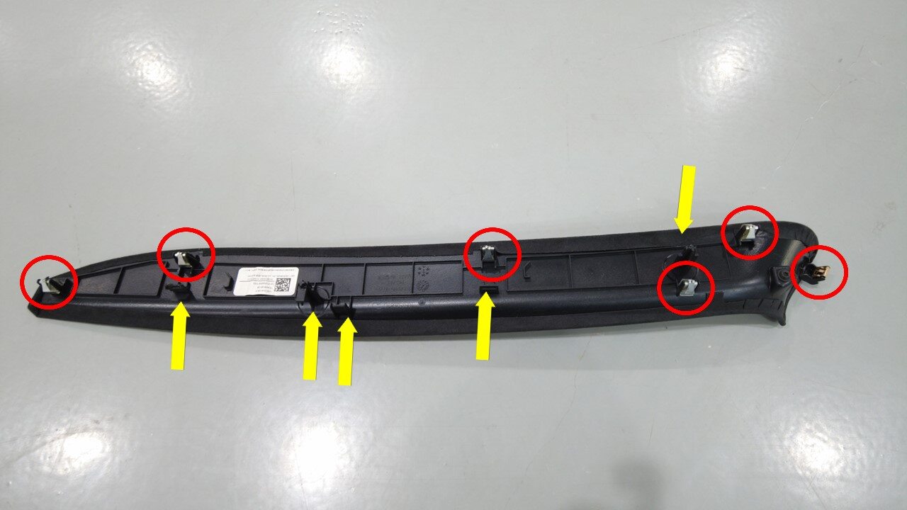 Remarque6x clips, 2x tabs, slide rearward, push down 2 metal tabs to release the trim