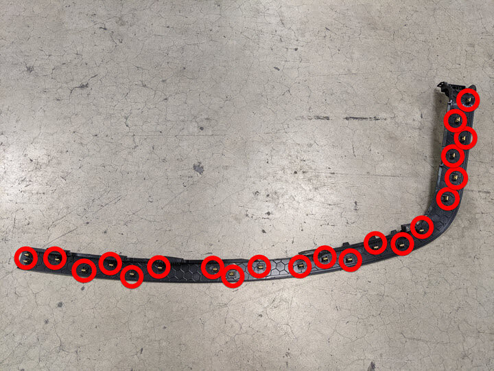 Remarque17x clips, 2x tabs, 1x connector may be present on early production vehicles