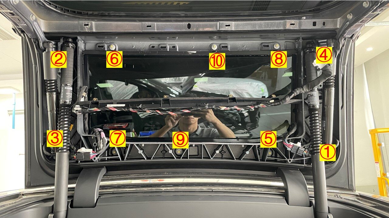 Remarque10x nuts, 10mm, 5 Nm, Add washers at the corners of glass to ensure flatness between glass and body, Number of washers added may vary, Torque at later step, Recommend assistance