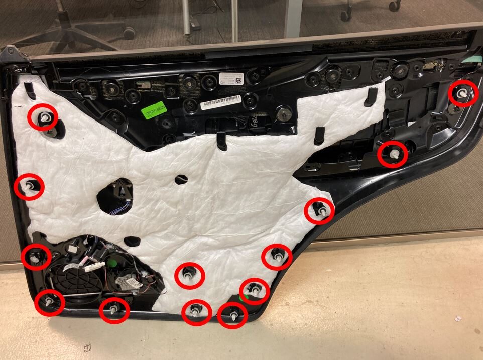 Remove bolts securing LH rear door panel to door
