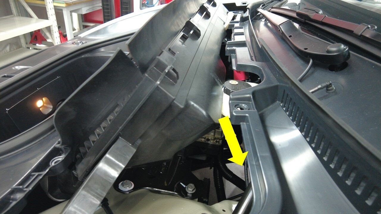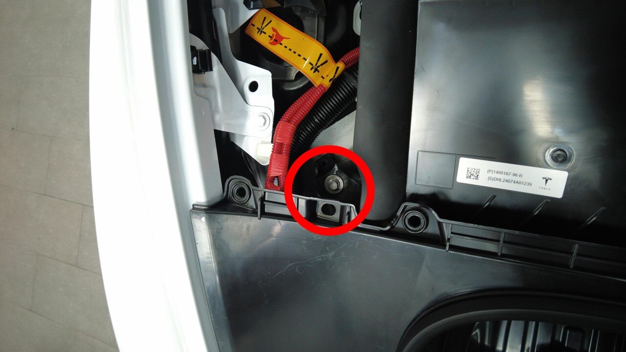 Note2x bolts, 10mm, 10 Nm, Pivot rear edge up past brake reservoir then lift up to clear frunk assembly
