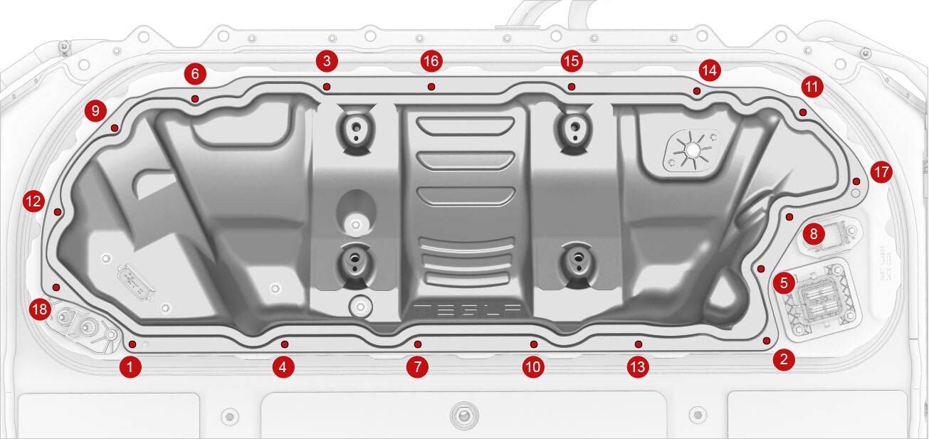 | Bolts (X18) securing ancillary bay cover to HV battery |