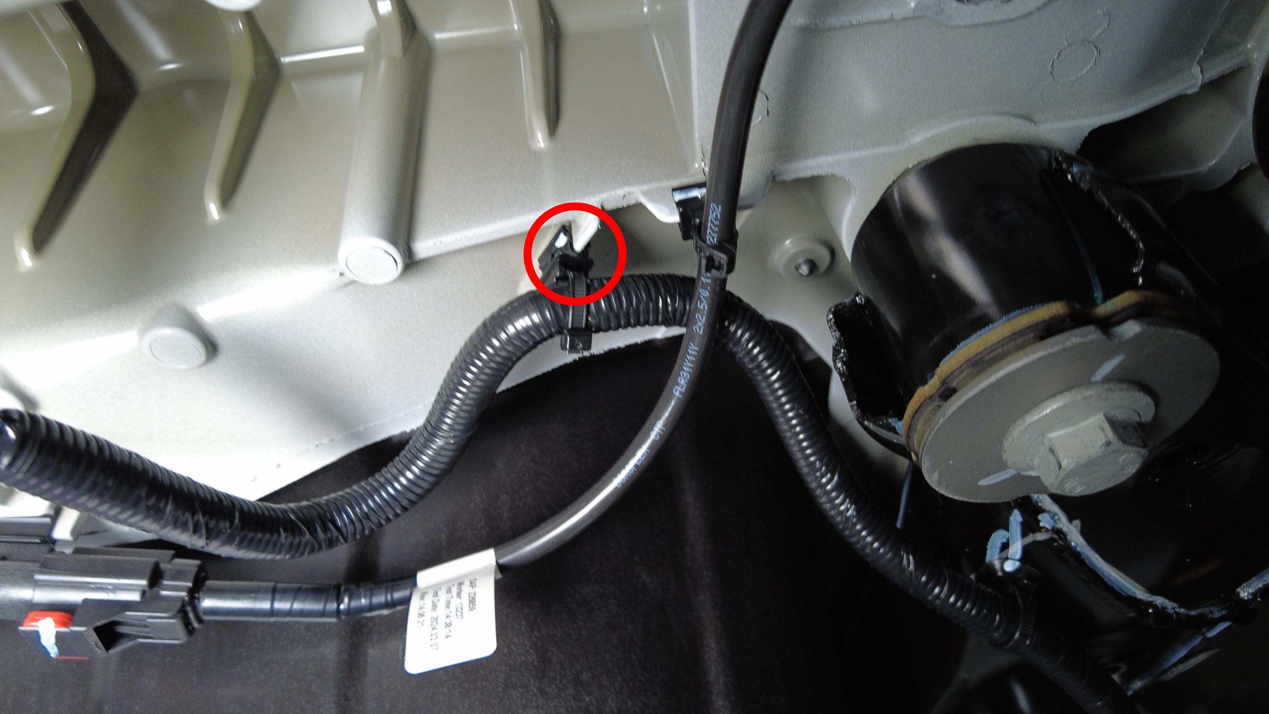 Install the RH 12V subframe harness clip into the rear subframe brace.