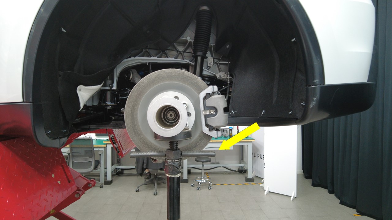 - Remove the LH and RH rear brake caliper from the knuckle and hang it from the body. See Brake Caliper - Rear - LH - Base (Remove and Replace).