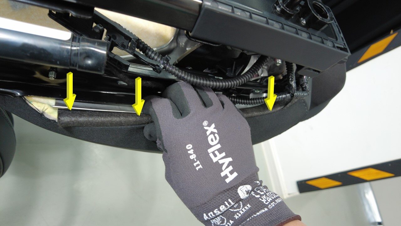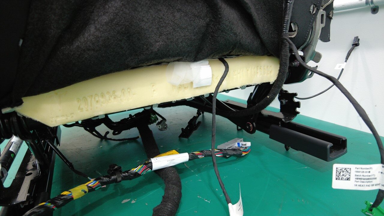 CAUTIONMake sure that the seat cushion heater pad connector and the seat occupied sensor assembly do not catch on the seat suspension or frame.