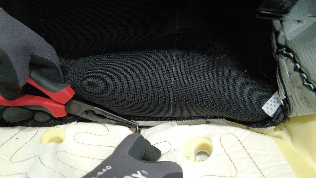 Install the hooks (x2) that attach the seat cushion cover to the seat cushion