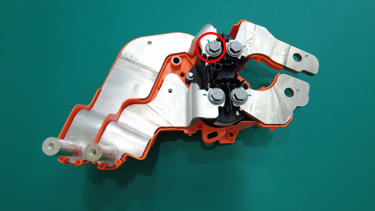 | Perno remachable que sujeta la barra colectora de entrada de carga rápida/conexión de corriente continua al contactor de carga rápida |