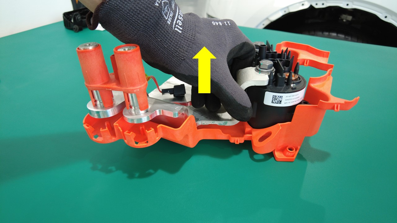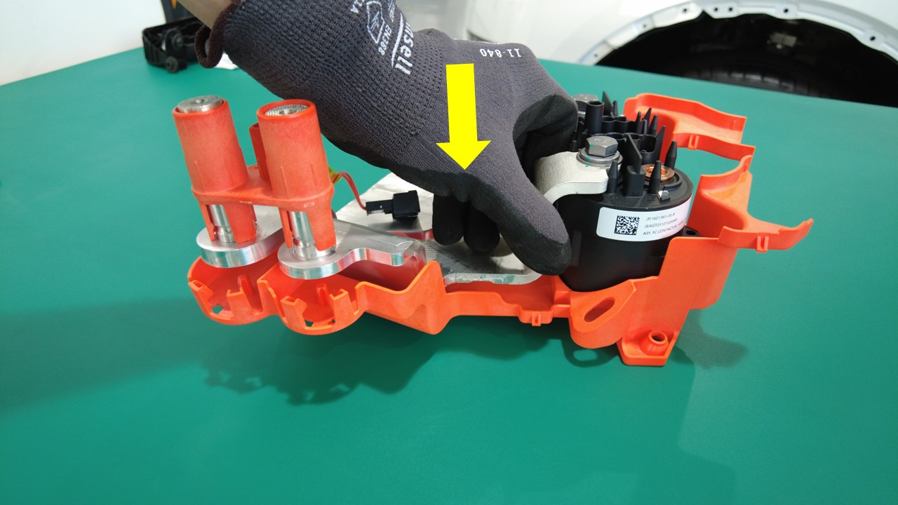 - Retire del conjunto del contactor de carga rápida la barra colectora positiva de la conexión de CC. Consulte Busbar - Fast Charge Contactor to DC Bus - Positive - PN Prefixed with 2xx (Remove and Replace).