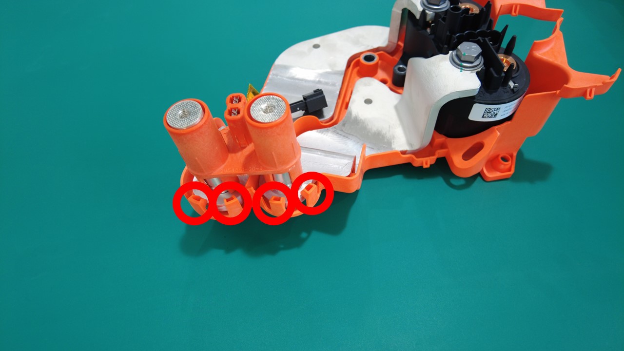 Suelte los clips (4 uds.) y los pasadores de centrado (4 uds.) y, a continuación, retire los pernos (3 uds.) que fijan el aislante inferior de carga rápida al conjunto del contactor de carga rápida.