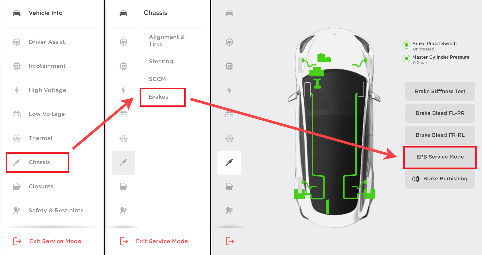 En la pantalla táctil, en la sección de información del vehículo, toque Chasis, Frenos y, a continuación, toque Modo de servicio del EPB en el diagrama.