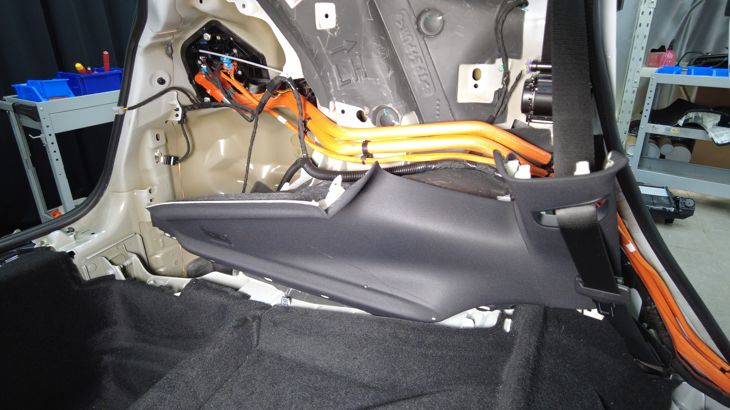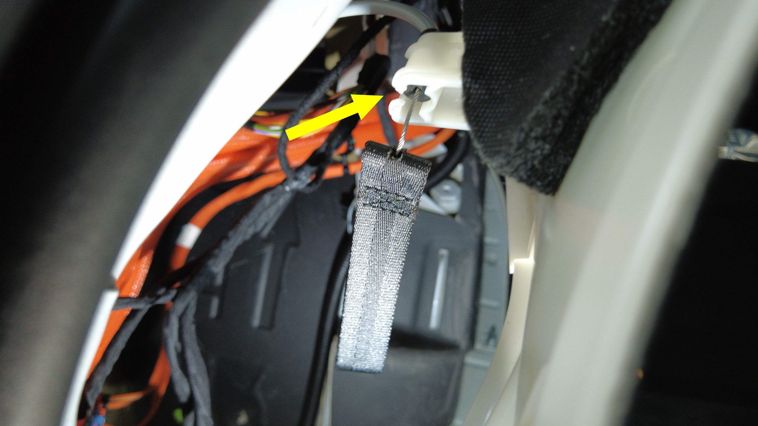 트림에서 충전 포트 수동 해제 케이블을 푼 다음 트림을 트렁크 바닥에 놓습니다.