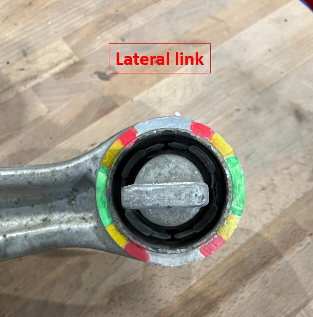 참고Look for cracks on the rubber partcompare the location according to the images and follow the guide: Damage is contained to the green zone: Do not replace the part• Damage is in the yellow zone on one side of the bushing: Do not replace the part• Damage is in the yellow zone on both sides of the bushing: Part needs replacement• Damage is in the red zone: Part needs replacement