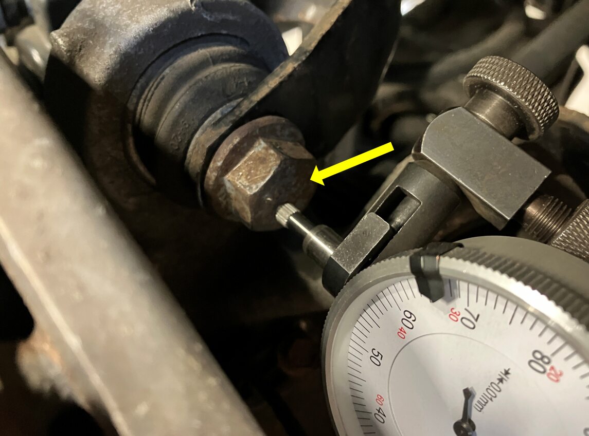 참고Insert medium size prybar between the aft link and the knuckle and push to check, make sure the prybar is pushing the noted area in the middle of the link's side, this will give proper measurement and avoid link rotation. Note the values of the analog indicator, replace RH Rear Upper Knuckle Ball Joint if the play is greater than 1,00mm