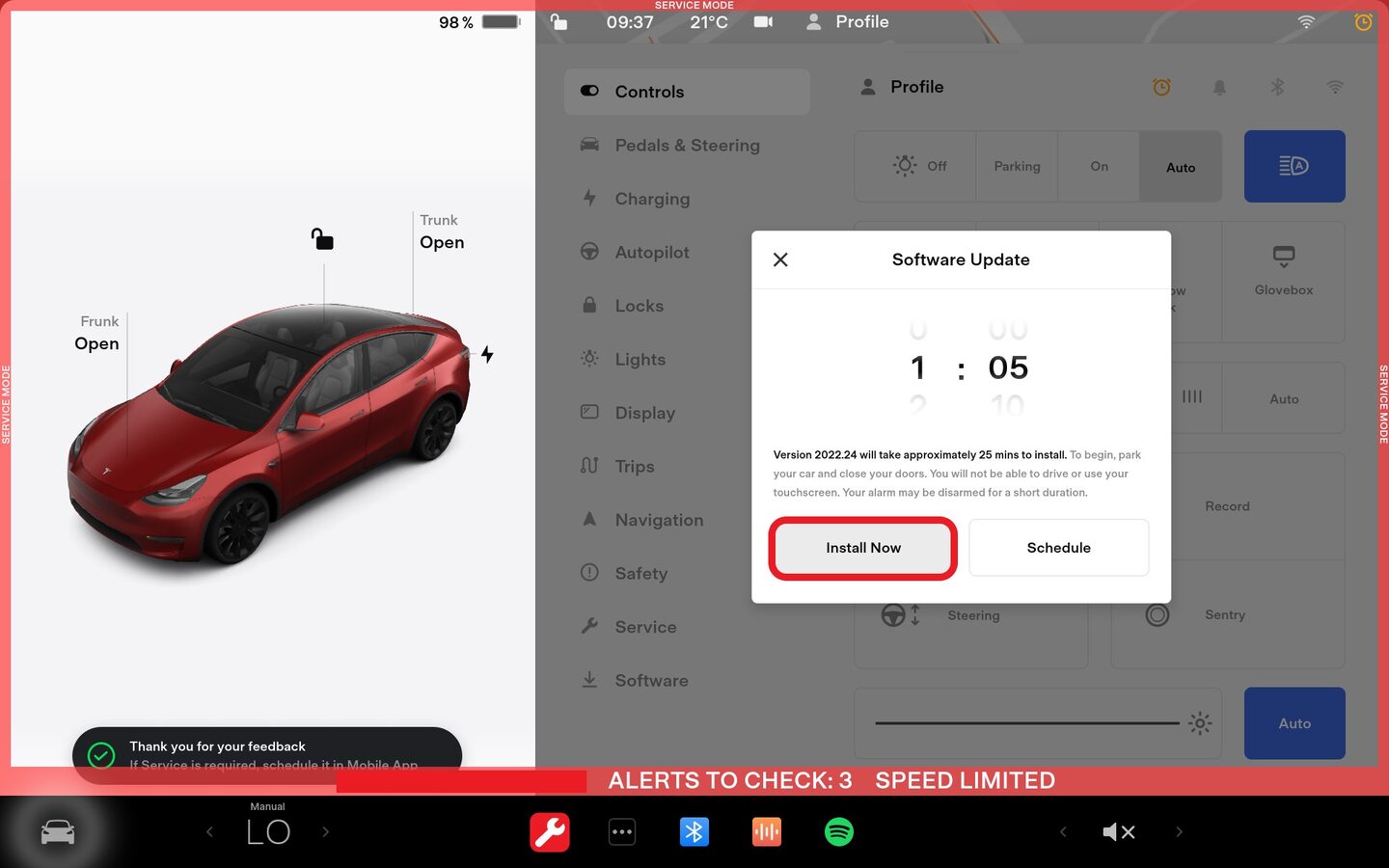 참고Select the clock on the center display, or go to the Software tab, then select install now to start firmware update. Select Install Now, Tap count down timer until clock runs down to 0, Check the center display and ensure the firmware package is installing