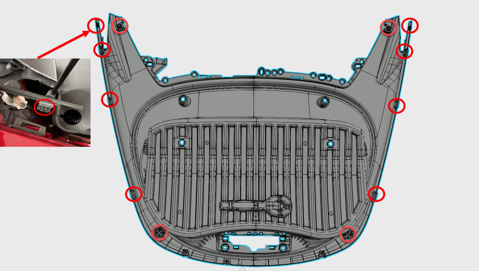 참고4x clips, 1x connector, Frunk safety switch, 3x guide tabs, Grab closeout panel from bottom then pull it upward to release clips, Disconnect switch