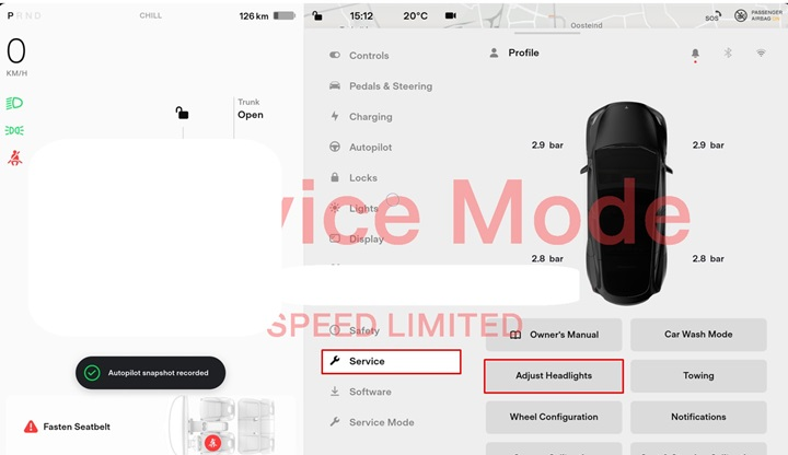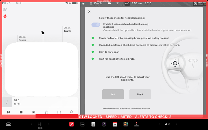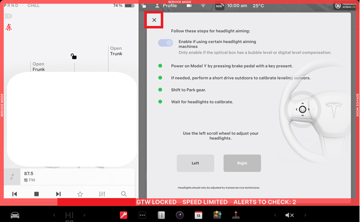 - 2025년형 이상 Model Y 프리미엄 및 퍼포먼스 버전: LH 헤드라이트용 헤드라이트 조준 장비 설정: 을 선택한 다음 LH 헤드라이트 아이콘을 선택합니다.참고헤드라이트는 ECE이며 글로벌이 아니지만, 빔 투사 방식은 글로벌 헤드라이트와 유사합니다. 따라서 Global을 프로그램 메뉴에서 선택해야 합니다.