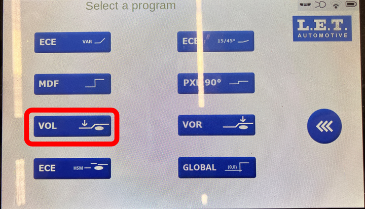 - 2025년형 이상 Model Y 표준 버전: LH 헤드라이트용 헤드라이트 조준 장비 설정: 을 선택한 다음 LH 헤드라이트 아이콘을 선택합니다.참고2025년형 이상 Model Y 표준 버전의 헤드라이트는 2025년형 이상 Model Y 프리미엄 및 퍼포먼스 버전의 빔 투사와 비교하여 독특한 빔 투사 방식을 가집니다. 따라서 VOL을 프로그램 메뉴에서 선택해야 합니다.