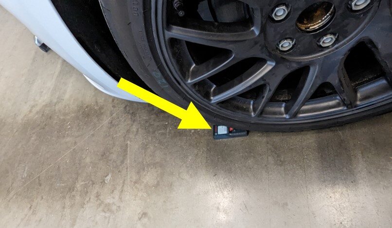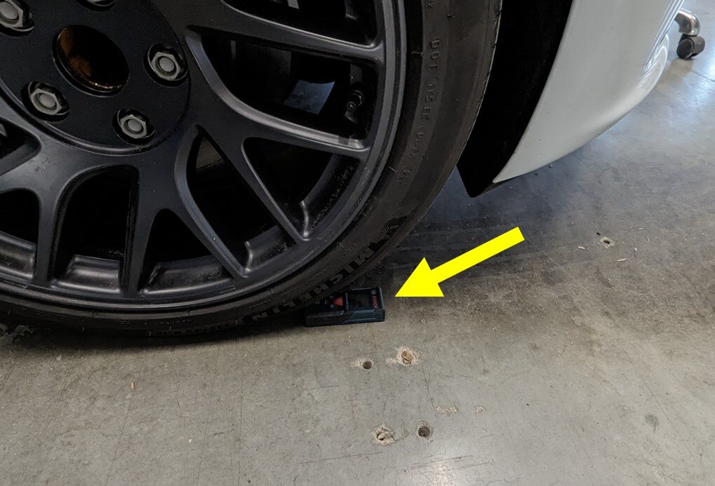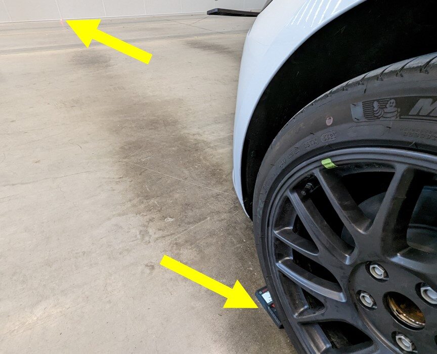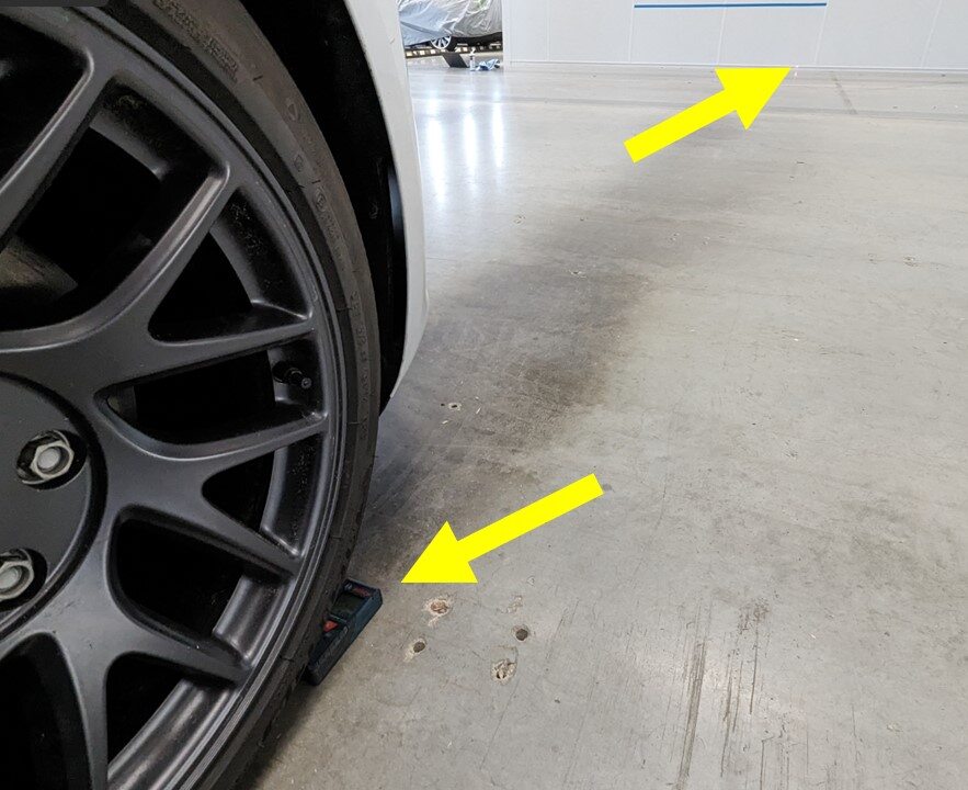 양쪽 전면 휠 중앙에서 벽까지의 거리를 측정합니다.