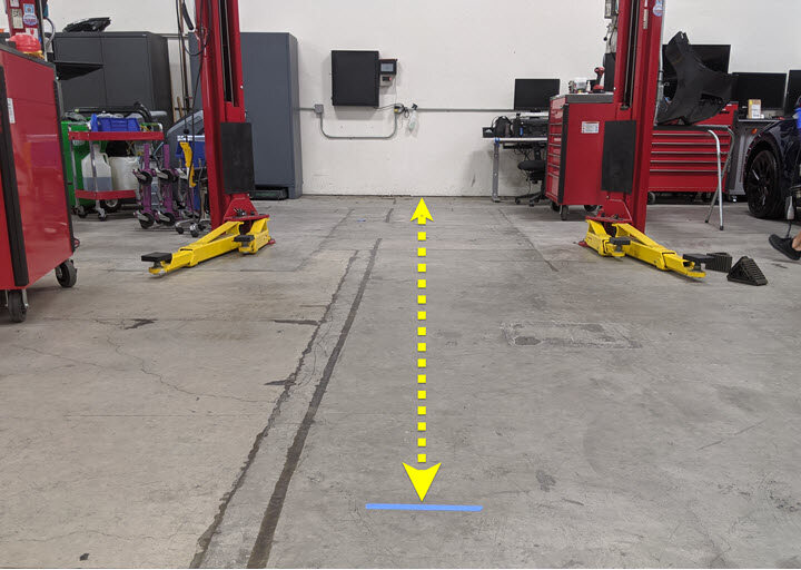 벽과 직각을 이루는 평평한 표면에 차량을 주차하고 전면 페시아를 바닥의 테이프에 맞춥니다.