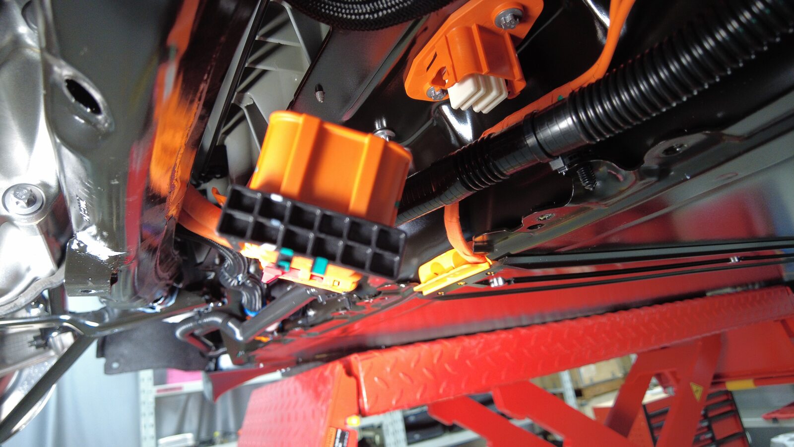 注将电缆旋转布设在副车架、后驱动电机和电池之间;请勿强行拉动后驱动电机软管。
